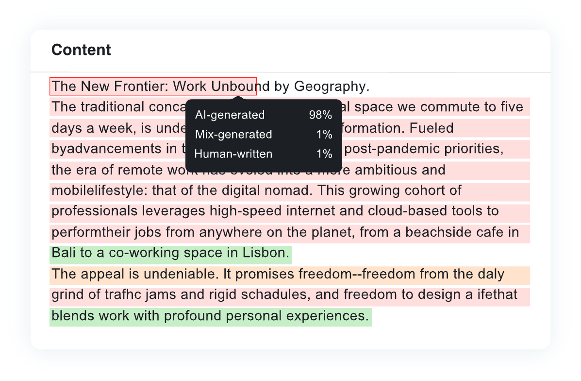 Get simple, color-coded reports that are easy to understand. Pinpoints the exact sentences that are likely AI-generated.